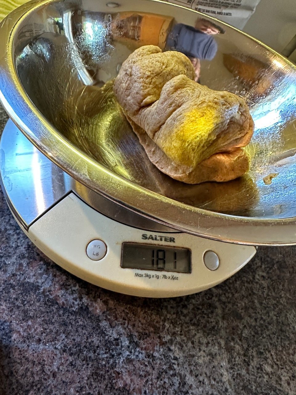 Dough has hopefully about doubled in size after rising. Remove dough into a clean bowl on a tared kitchen scale to get a total dough weight. Then turn onto a cutting board and shove into a rough log for ease of chopping. (Dough should be oily so no flour needed on the cutting board.) Chop into pieces, and trim off and smoosh on to desired weight, depending on what size of pizza you want: