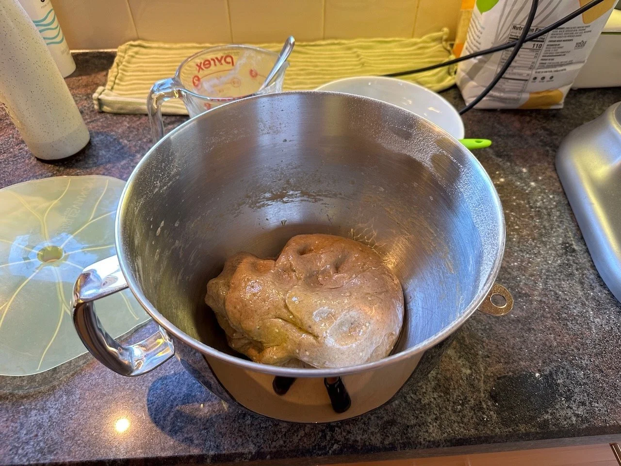 This dough is just barely sticking to the scraper; if you can work with it, this is a great moisture content.