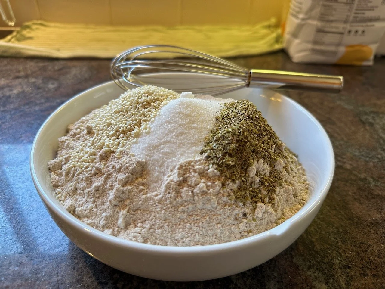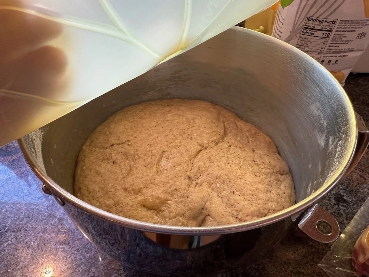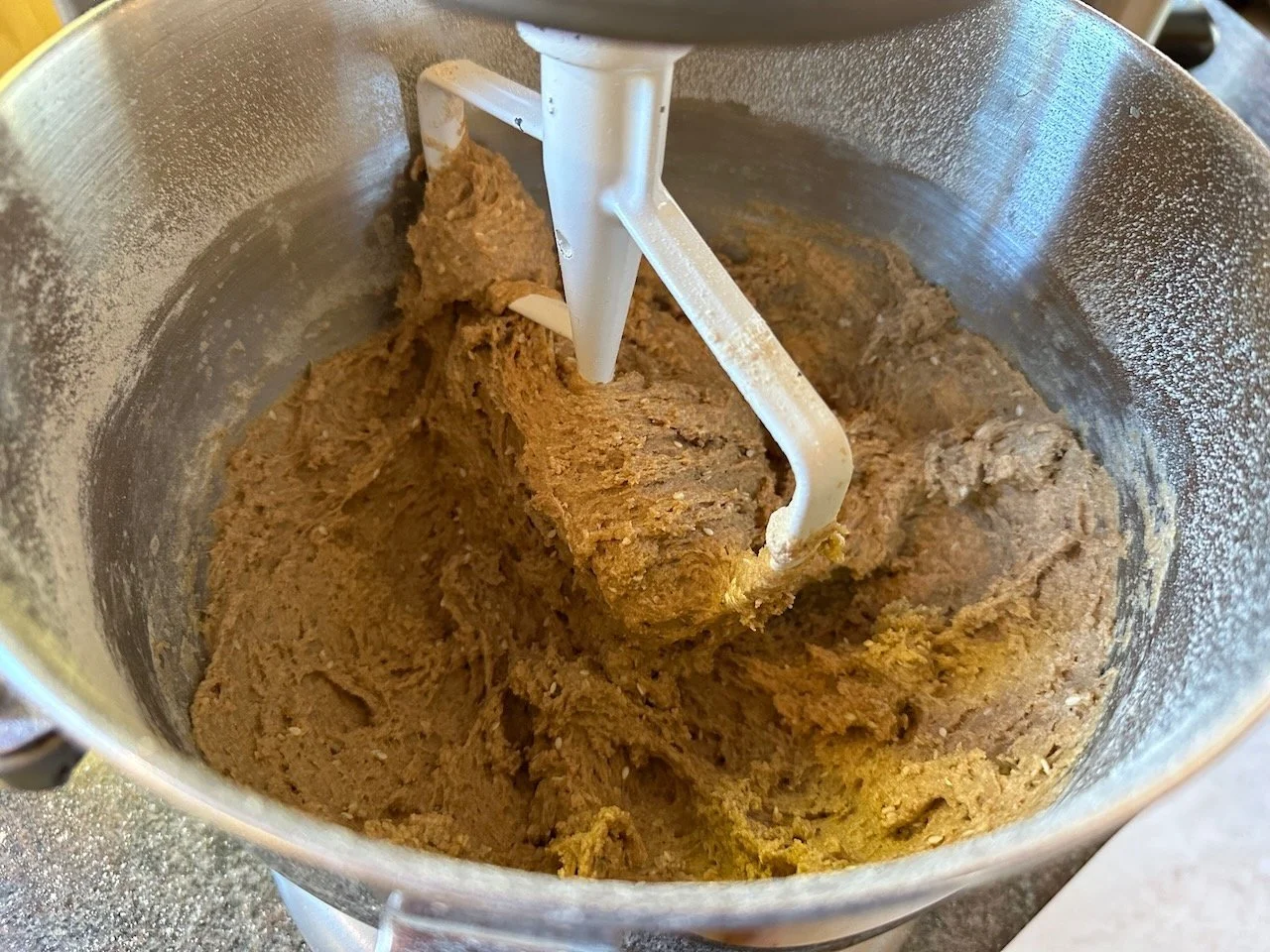 Pour the active yeast & water mixture into a mixing bowl with a paddle. Mix in: