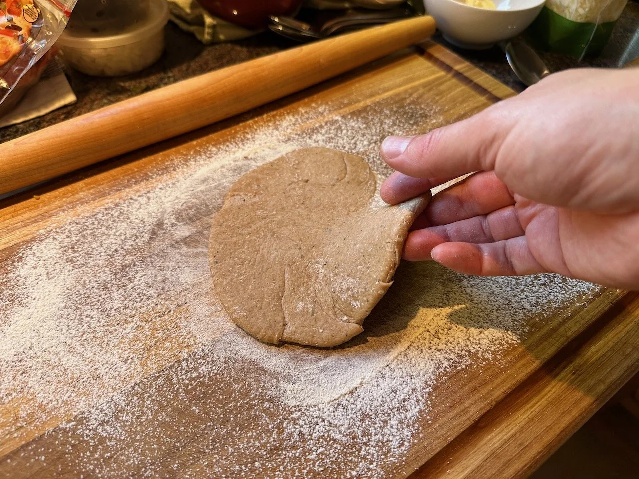 I’ve found using a rolling pin easiest. Be liberal with dusting flour; having a flour shaker in your kitchen is a handy tool. Always lift and turn to make sure it’s not sticking; the dough shouldn’t tear easily.