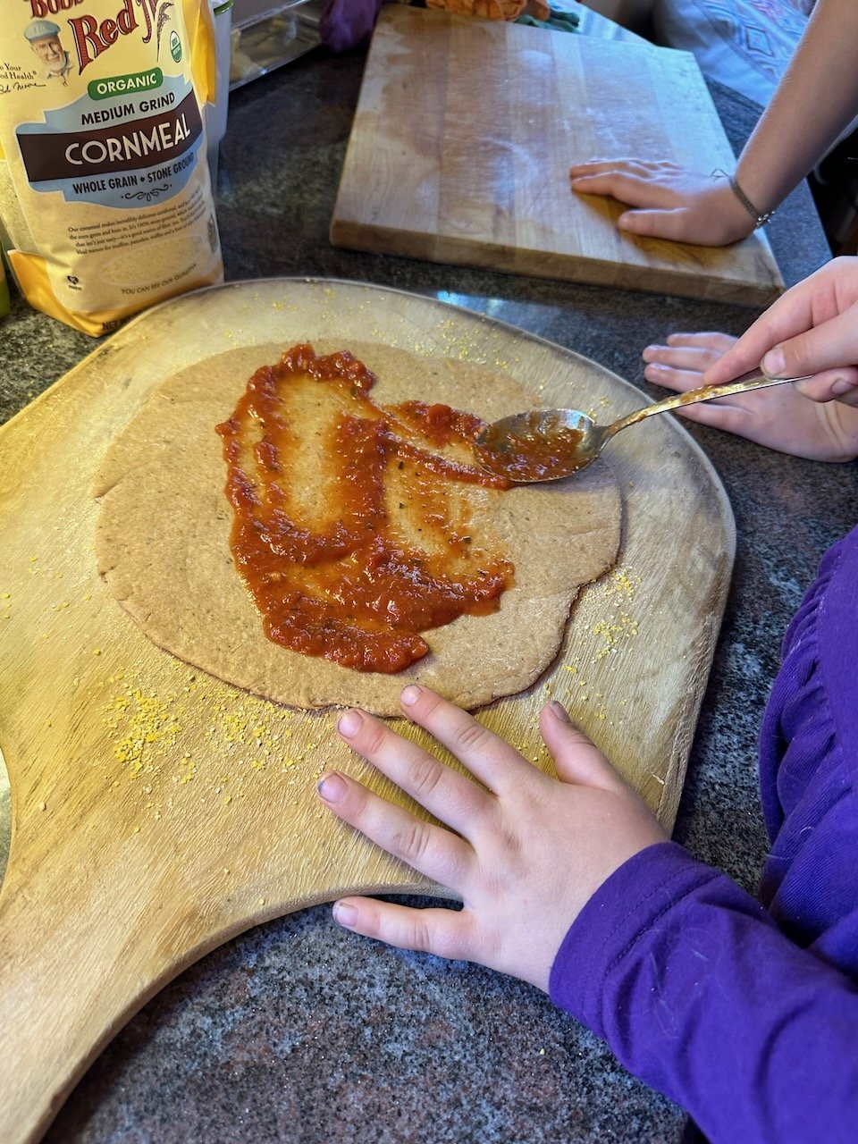 The back of a spoon is great for spreading pizza sauce. Adding topping directly on the wooden pizza peel is easy, but make sure the peel has cornmeal to allow the pizza to roll off into the oven, and make sure no topping or sauce get onto the peel (moisture will make the pizza stick).