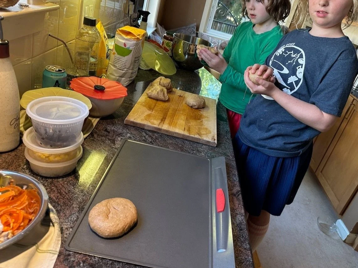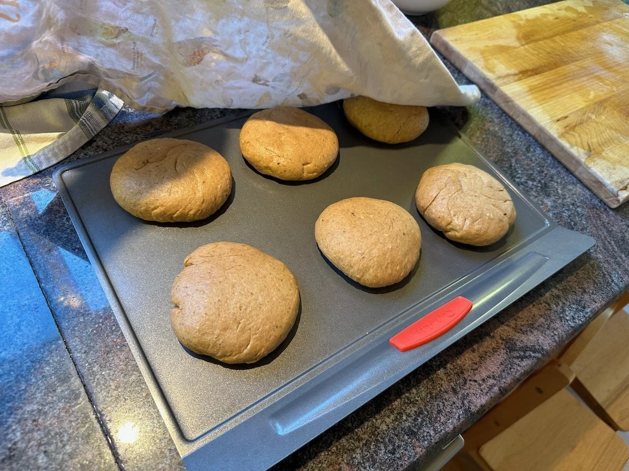 Once you have the dough clumps you want, roll each clump between your hands until a nice ball is formed. Smoosh the ball lightly onto a clean cookie sheet or some kitchen bowls, cover with a moist kitchen towel, and refrigerate until needed.